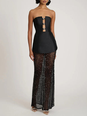 Shine in sophistication with this elegant strapless maxi dress, adorned with shimmering sequins for a dazzling effect. Its strapless neckline highlights your shoulders gracefully, while the flowing maxi silhouette ensures a flattering and comfortable fit for any formal occasion or evening event.