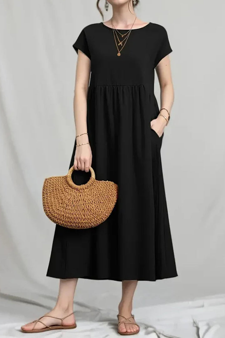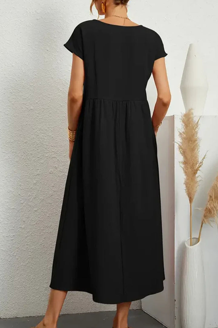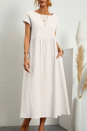 Einfarbiges Kurzarm-Midikleid aus Baumwollleinen